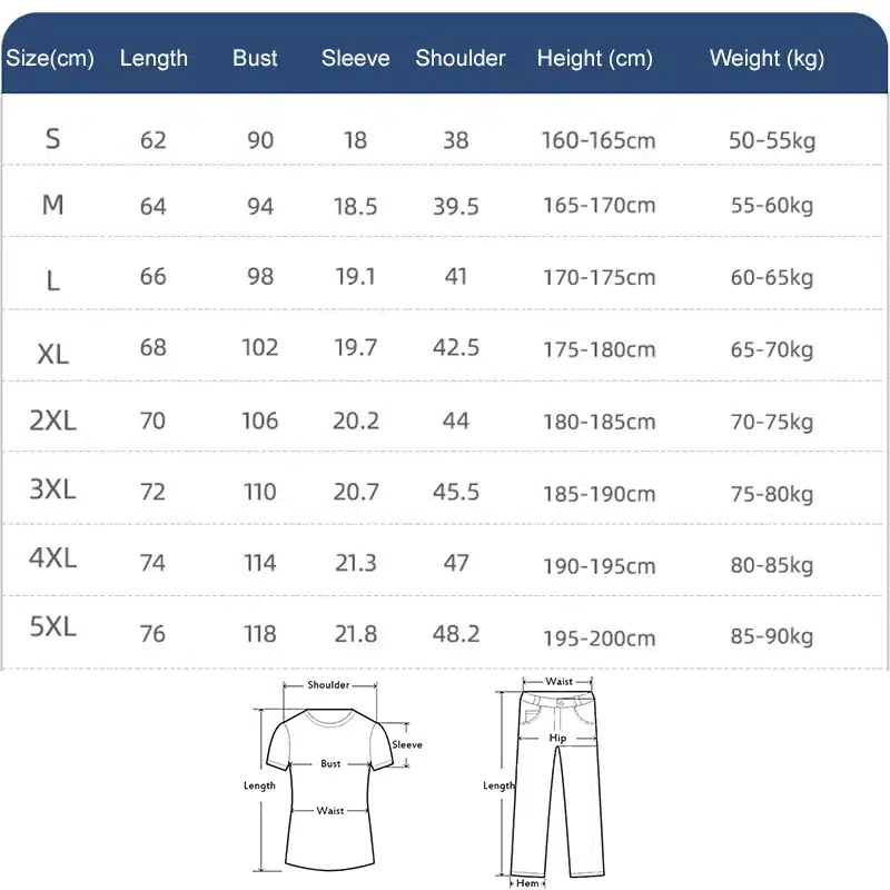 5XL =Bust 118 cm ,Shoulder 48.2 cm ,Sleeve 21.8 cm , Length 76cm , For Weight 85-90kg Height 195-200cm;