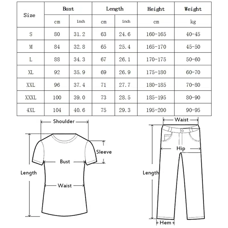 4XL =Bust 104cm, Length 75cm , For Weight 90-95kg Height 195-200cm;
