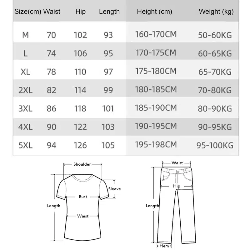 5XL =Waist 94 cm ,Hip 126 cm , Length 105cm, For Weight 95-100kg Height 195-198cm;