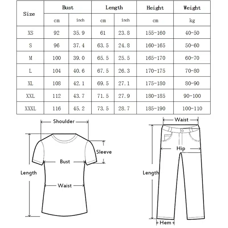 XXXL =Bust 116cm , Length 73.5cm,For Weight 100-110kg Height 185-190cm;