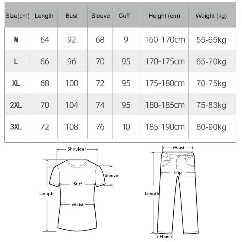 3XL =Bust 108 cm ,Sleeve 76 cm , Length 72cm ,Cuff 10 cm , For Weight 80-90kg Height 185-190cm;