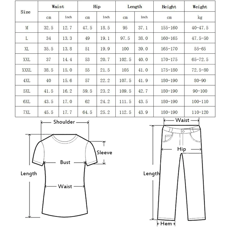 8XL =Waist 47.5cm ,Length 113.5cm,Hip 67cm , For Weight 120-130kg Height 180-190cm;