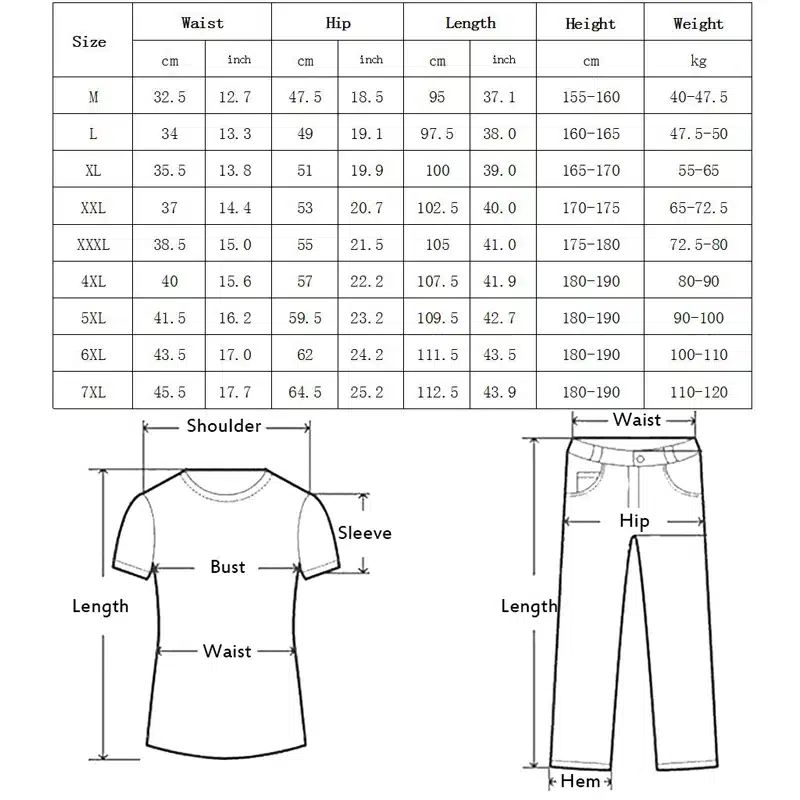 9XL =Waist 49.5cm ,Length 113.5cm,Hip 69.5cm,For Weight 130-150kg Height 180-190cm;