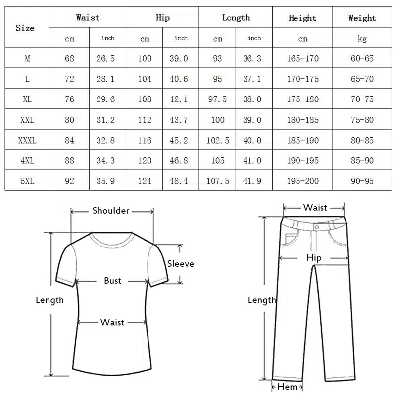4XL =Waist 88cm , Length 105cm, Hip 120cm ,For Weight 85-90kg Height 190-195cm;